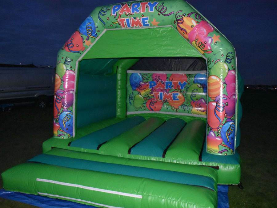 12 X 15 Party Time Green Bouncy Castle, ideal for many of occasions with a neutral theming its suitable for parties for birthdays, dinosaurs themes, the hulk much more.