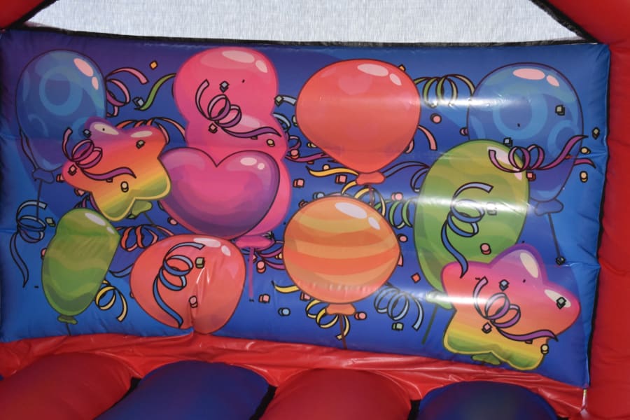 12 x 18 Blue & Red Party Time Combo Bouncy Castle Slide, this neutral unisex theme is ideal for a large variety of events and parties from BBQs to Christenings and EID celebrations even Weddings